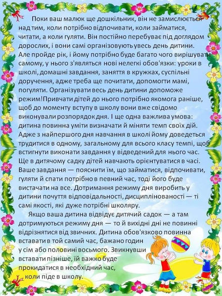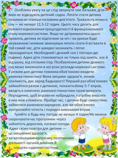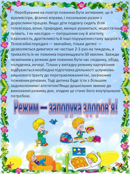 Дошкільний вік ваших дітей – це важливий період для виховання й розвитку тих умінь і навичок, які слугуватимуть їх здоров΄ю все життя. І не менш важливий період для закладання підвалин міцного здоров΄я, здорової психіки, моральної стійкості, гармонійного розвитку, уміння і потреби саморозвитку. Дитині необхідні розумні правила і обмеження, які поступово з΄являються в їхньому житті.