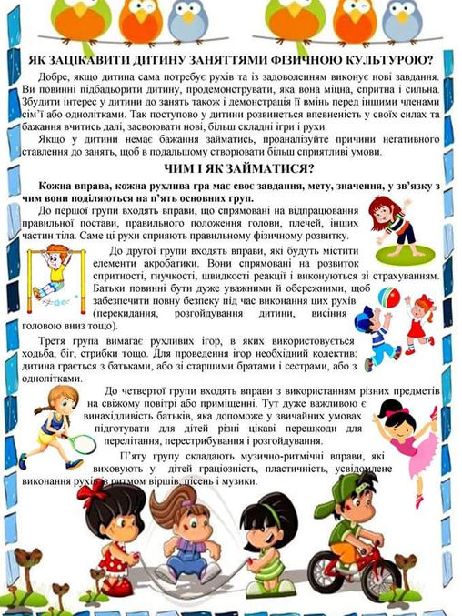 Займайтесь фізичною культурою, виконуйте вранці вправи ранкової гімнастики. Виробляйте сталу звичку та потребу в цьому. Практикуйте вдома певну систему оздоровлення всіх членів родини, в тому числі й дитини.